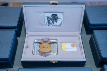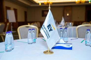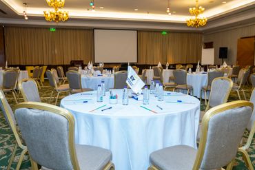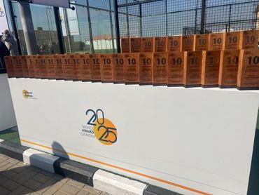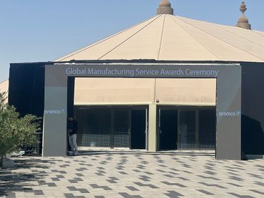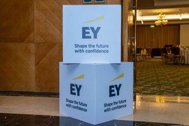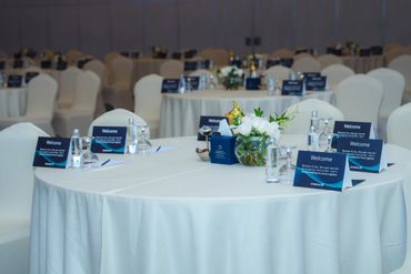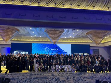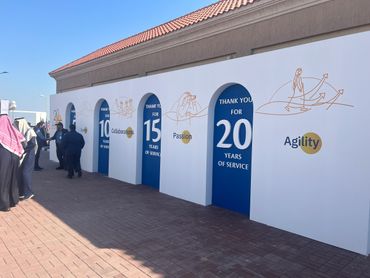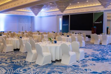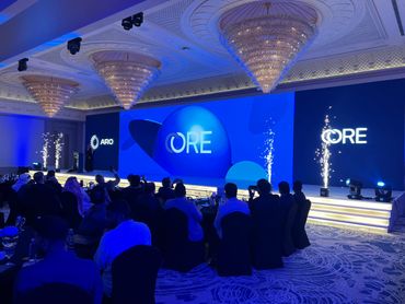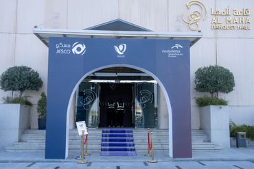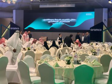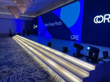 جمهور فعالية الشركات يشاهد منصة LED كبيرة مزودة بصور تحمل العلامة التجارية، بينما يقوم مصور محترف بالتقاط صور للحدث، وعرض أعمال معرض Rizq Events وإنتاج الفعاليات.
